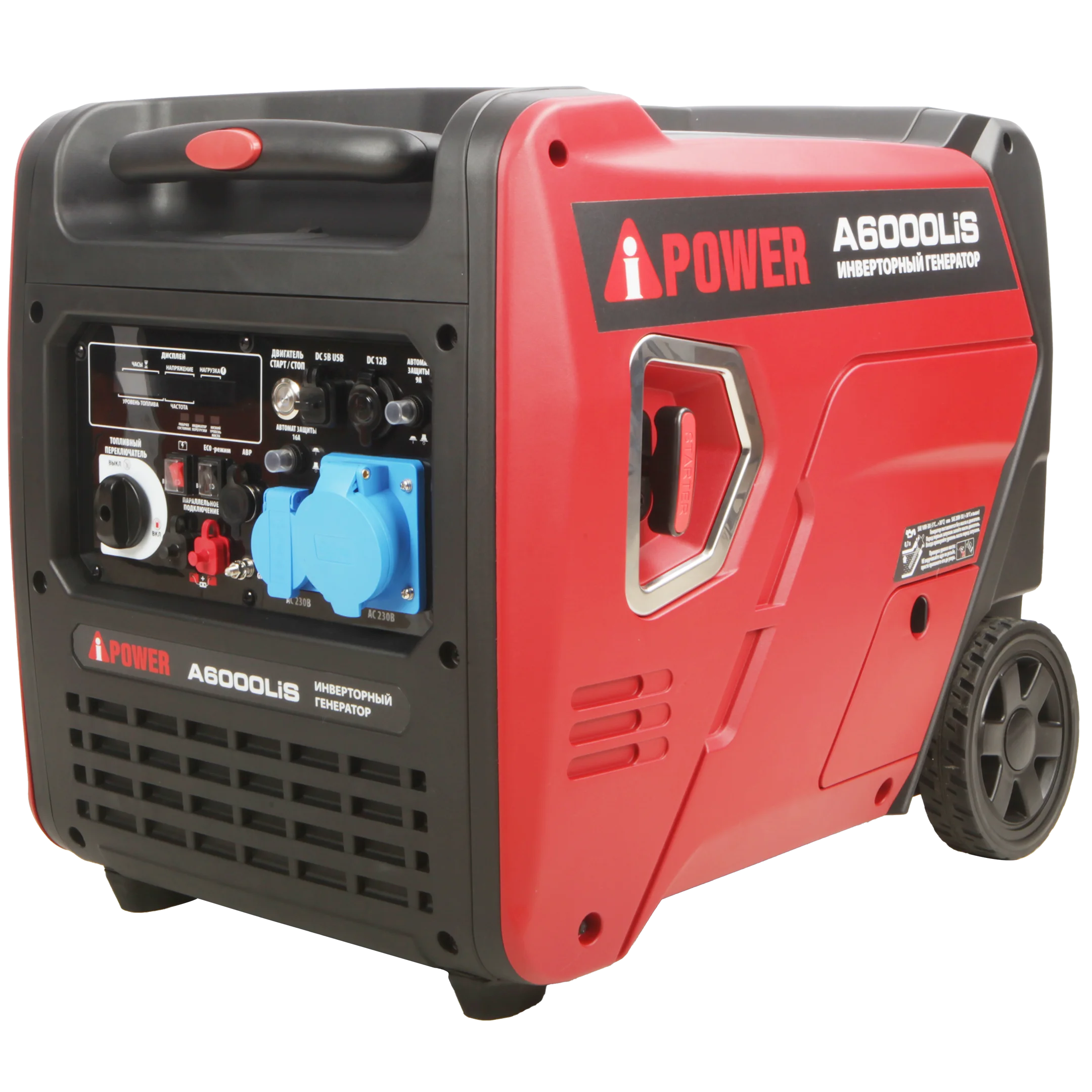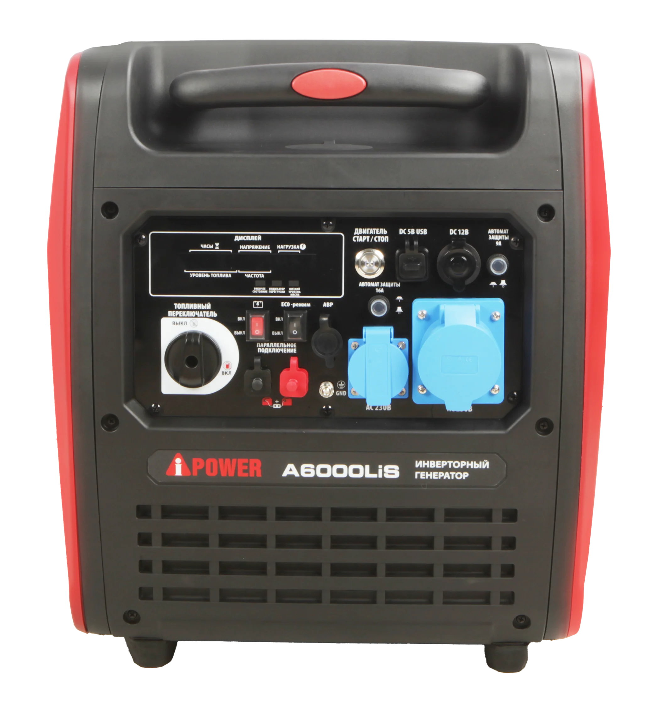 Инверторный генератор A-iPower A6000LiS входит в линейку инверторных генераторов обеспечивают стабильно высокое качество напряжения и тока. Чистая синусоида на выходе позволяет подключать абсолютно любые потребители без дополнительных внешних стабилизаторов. Резервный однофазный (230В) источник электропитания, максимальная мощность 6 кВт, номинальная мощность 5.5 кВт. Запускается вручную (тросом) / электростартером (кнопка старт/стоп) / автозапуск (доп.опция). Тихий и удобный в транспортировке. Уровень шума до 64дБ. Оснащён телескопической ручкой и колесами. Стандартная гарантия 2 года, расширенная гарантия 4 года, при покупке у авторизованных дилеров. Преимущества и описание элементов: - Одна бытовая розетка на 230 Вольт / 16 Ампер; - Одна силовая розетка на 230 Вольт / 16 Ампер; - USB-выход для подключения гаджетов для зарядки; - Розетка постоянного тока "прикуриватель" на 12В; - Автоматы защиты от перегрузки на каждую розетку. Срабатывают при подключении избыточной нагрузки на любую из розеток; - Защита всех розеток и автоматов от пыли и влаги. Обеспечивает безопасную эксплуатацию генераторной установки; - Выход для подключения АВР. Возможно подключение блока автозапуска и настройки резервного питания дома; - Параллельное подключение. Два инверторных генератора A-iPower можно объединить по мощности с помощью специального блока параллельной работы; - Цифровой дисплей в режиме реального времени показывает значения: напряжение, частота, количество моточасов; - Кнопка старт/стоп; - Клавиша включения / выключения экономичного режима; - Клавиша для активация батареи; - Индикатор низкого уровня масла. Генератор не заведется при недостаточном количестве масла в картере, информация о низком уровне масла отображается на дисплее. Инверторный генератор A-iPower A6000LiS укомплектован компактным модернизированным четырехтактным гильзованным OHV-двигателем объемом 322 см3 с ручным запуском и электростартером. Объем масляного картера 0.7 литра. Бензин АИ-92.