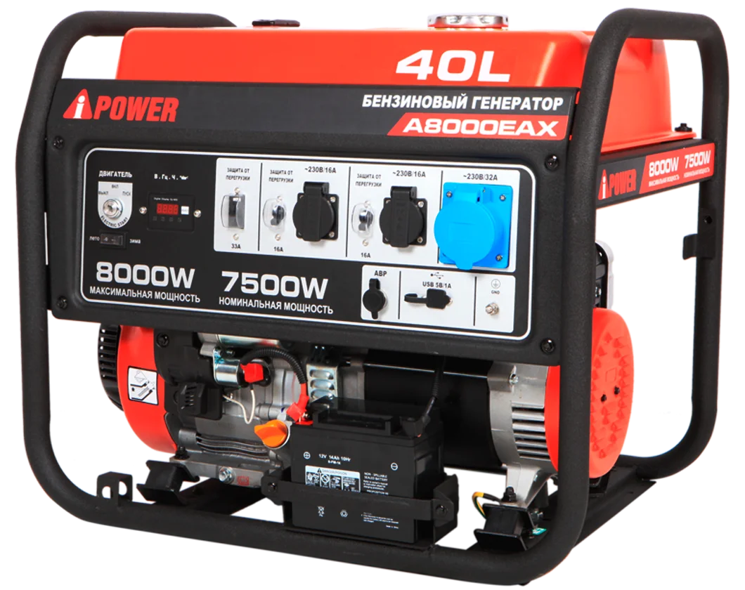 Бензогенератор A-iPower A8000EAX - Резервный однофазный (230В) источник электропитания, максимальная мощность 8.0 кВт, номинальная мощность 7.5 кВт. - Запускается вручную (тросом) / электростартером (поворот ключа) / автозапуск (доп.опция). - Стандартная гарантия 2 года, расширенная гарантия 4 года, при покупке у авторизованных дилеров. - Входит в линейку Серия A (Премиум серия), подойдет как для бытового, так и профессионального использования. - Особенности: Высокий пусковой ток и режим работы с АВР Зима/Лето. Преимущества и описание элементов: - Две бытовые розетки на 230 Вольт /16 Ампер; - Одна силовая розетка 230 Вольт /32 Ампера; - USB-выход для подключения гаджетов для зарядки; - Автоматы защиты от перегрузки на каждую розетку. Срабатывают при подключении избыточной нагрузки на любую из розеток; - Защита всех розеток и автоматов от пыли и влаги. Обеспечивает безопасную эксплуатацию генераторной установки; - Переключатель Зима/Лето Регулирует работу заслонки и прогрева двигателя в зависимости от температуры воздуха; - Восьмипиновый выход для подключения блока автоматики (АВР); - Цифровой дисплей в режиме реального времени показывает значения: напряжение, частота, количество моточасов; - Индикатор низкого уровня масла. Генератор не заведется при недостаточном количестве масла в картере, информация о низком уровне масла отображается на дисплее. Электрогенератор A-iPower A8000EAX укомплектован четырехтактным гильзованным OHV-двигателем объемом 459 см3 с ручным запуском и электростартером. Объем масляного картера 1.1 литр. Бензин Аи-92. Режим зима/лето - это автоматическое управление дроссельной заслонкой и прогревом двигателя исходя из температуры окружающей среды. Данный режим имеется в моделях с возможностью подключения блока автозапуска и работает при подключении АВР. Автоматический регулятор напряжения (AVR) высокого качества обеспечивает выходное стабильное напряжение, без скачков и провалов даже при максимальных нагрузках.