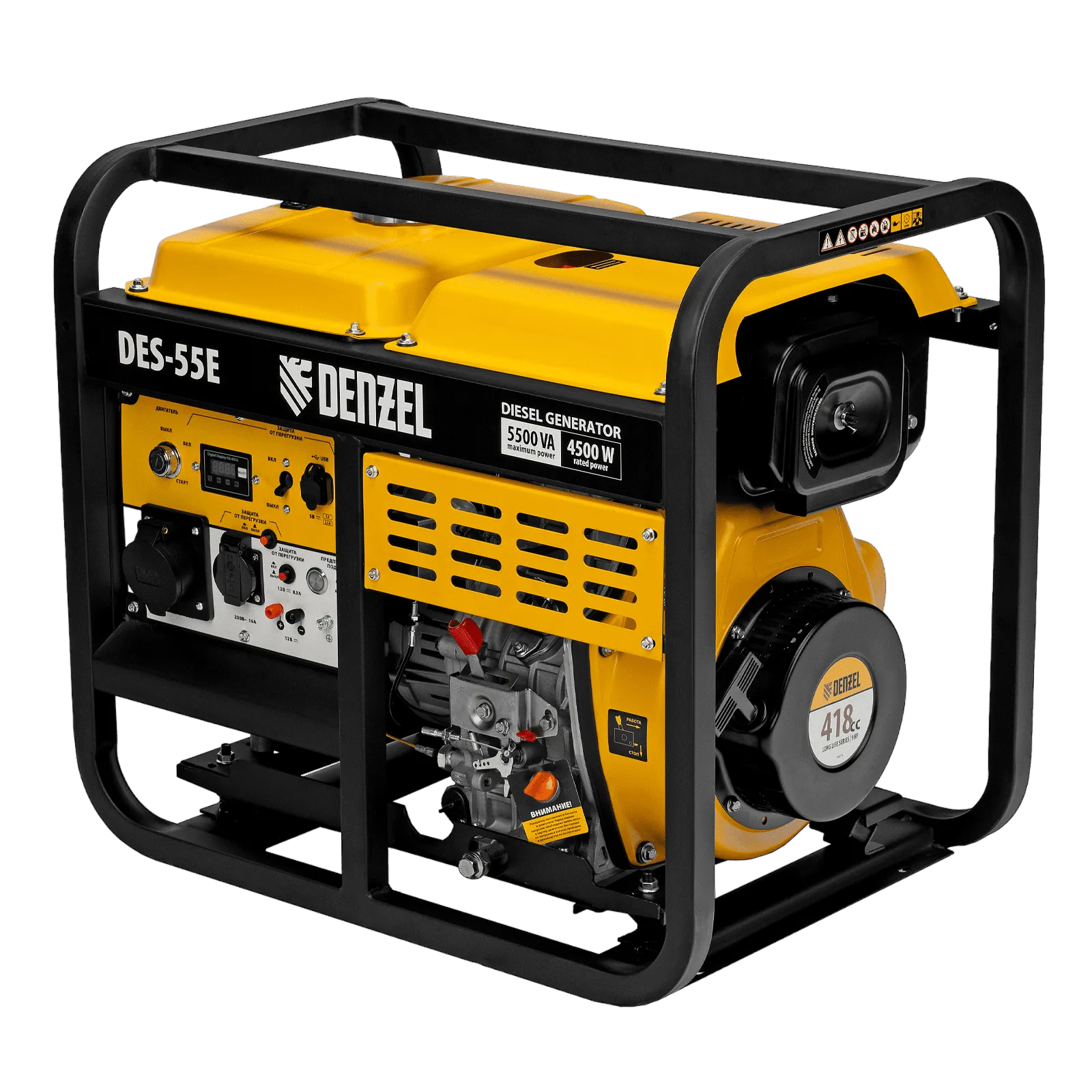 Генератор дизельный Denzel DES-55E 94414 с объемом топливного бака 11 л, с электростартером, имеет максимальную выходную мощность 5,5 кВт и поддерживает напряжение в сети 230 В. Используется для снабжения энергией потребителей однофазного тока (осветительных приборов, бытовой техники, электроинструмента) при отсутствии доступа к стационарному источнику питания. Для подключения электроприборов служат 2 розетки: 230 В/16 А и 230 В/32 А. Клеммы постоянного тока 12 В позволяют заряжать автомобильные аккумуляторы, а двойной выход USB 5 В предназначен для подключения мобильных устройств (планшетов, смартфонов и т. д.). Генератор пригодится в загородном доме. Преимущества: - Возможность подключения чувствительных приборов — система AVR выравнивает выходное напряжение; - Надежность — мощный 4-тактный двигатель на 9 л. с. с медной обмоткой альтернатора; - Быстрый старт — для запуска двигателя достаточно повернуть ключ в замке зажигания; - Уверенный запуск — ручной стартер позволяет запустить генератор, даже если бортовой аккумулятор разрядился, функция предпускового подогрева облегчает эксплуатацию в зимний период; - Экономичность — полностью заправленного бака хватит на 6 часов непрерывной работы; - Работа без непредвиденных остановок — индикатор уровня топлива; - Степень защиты IP23 — внутренние компоненты надежно изолированы от попадания влаги и крупных частиц размером не менее 12,5 мм; - Удобный контроль работы — ключевые параметры отображаются на цифровом мультифункциональном дисплее; - Защита двигателя — генератор не запустится при недостаточном уровне масла в картере, фильтры препятствуют попаданию твердых частиц в цилиндры, а также посторонних примесей в топливо; - Усиленная конструкция — мощная рама защищает установку от повреждений во время транспортировки или работы; - Готовность к работе — аккумулятор и ключи зажигания в комплекте; - Мобильность — к генератору можно приобрести транспортировочный комплект Denzel для перемещения; - Гарантия 3 года.