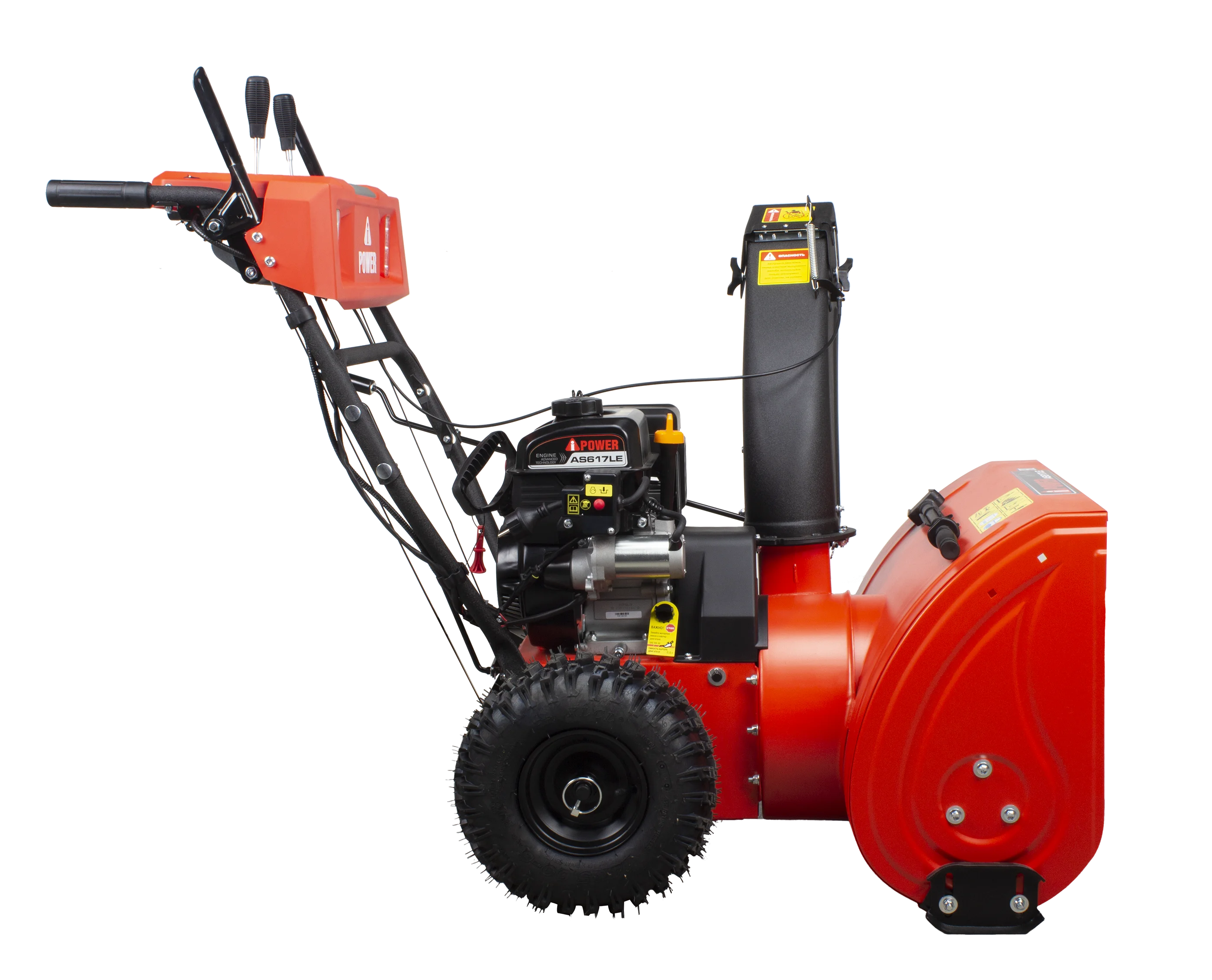 Бензиновый самоходный снегоуборщик A-iPower AS617LE - идеальное решение для очистки от снега небольших и средних площадей придомовых территорий загородных домов, парковок, торговых уличных площадей, дворов жилых комплексов и в других местах, где требуется оперативная и качественная уборка снега. - Резиновые большие колеса с протектором не скользят. - Желоб легко поворачивается с помощью рукоятки, угол поворота 190 градусов. - Самоходный механизм сильно облегчает работу. - Возможность работы как на ровной поверхности с твердым покрытием, так и на неровных например гравийных поверхностях. - Фары ближнего света облегчают работу в ночное время. - Запускается электростартером от вилки 220В, незаменимая функция в морозы. - Подогрев ручек делает работу со снегоуборщиком комфортной. - Стандартная гарантия 2 года + 2 года расширенной гарантии при покупке в авторизованном магазине. Преимущества и описание элементов: - Максимальная ширина захвата 61 см; - Максимальная высота захвата 54 см; - Шестерни червячного редуктора выполнены из бронзы; - Крепкий шнек прослужит много лет; - Двигатель 212 куб см рассчитан на бесперебойную работу при температуре -35С; - Мощность двигателя 7 л.с.; - Скорости: 6 передних/2 задние; - Непрерывная работа до 3 часов; - Дальность выброса снега до 12 м; - Работа "одной рукой"; - Счётчик моточасов на панели; - Подогрев ручек с выведенным выключателем.